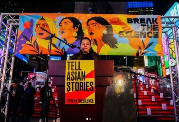 Elizabeth speaking out against anti-Asian violence in New York. (Photo courtesy of Elizabeth Kari/ AAP(I belong)®