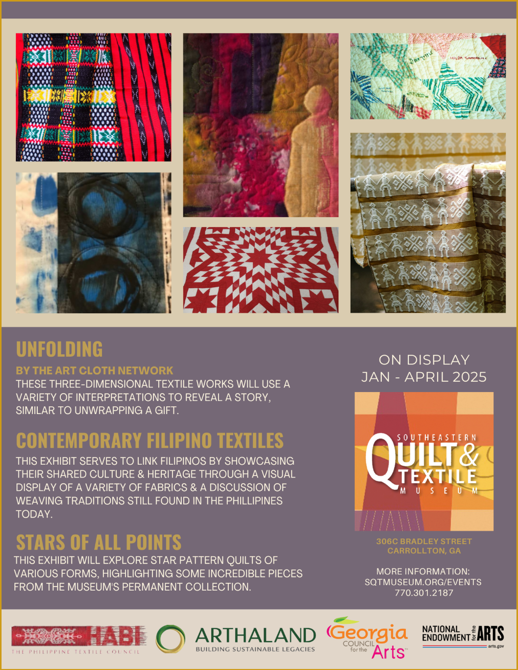 /This January the Southeastern Quilt and Textile Museum will open three new exhibits that will run from through April of 2025. Each of these unique exhibits will highlight a different type of textile art providing for a multifaceted museum experience. The third exhibit brings a taste of Filipino heritage to West Georgia with Chiara Cox's exhibit “Contemporary Filipino Textiles.” This exhibit serves to link Filipinos in the USA and Filipinos in the Philippines by showcasing their shared culture and heritage through a visual display of a variety of fabrics and a discussion of weaving traditions still found in Luzon, Visayas and Mindanao today. By exhibiting different Philippine weaves, this collection aims to preserve Filipino cultural heritage, keep the legacy of traditional Filipino weavers alive, and educate the diaspora of Filipinos about their cultural inheritance. This exhibit will be on display from January 8 - April 5 of 2025 and is sponsored in part by the Philippine Textile Council: Habi and Arthaland.
