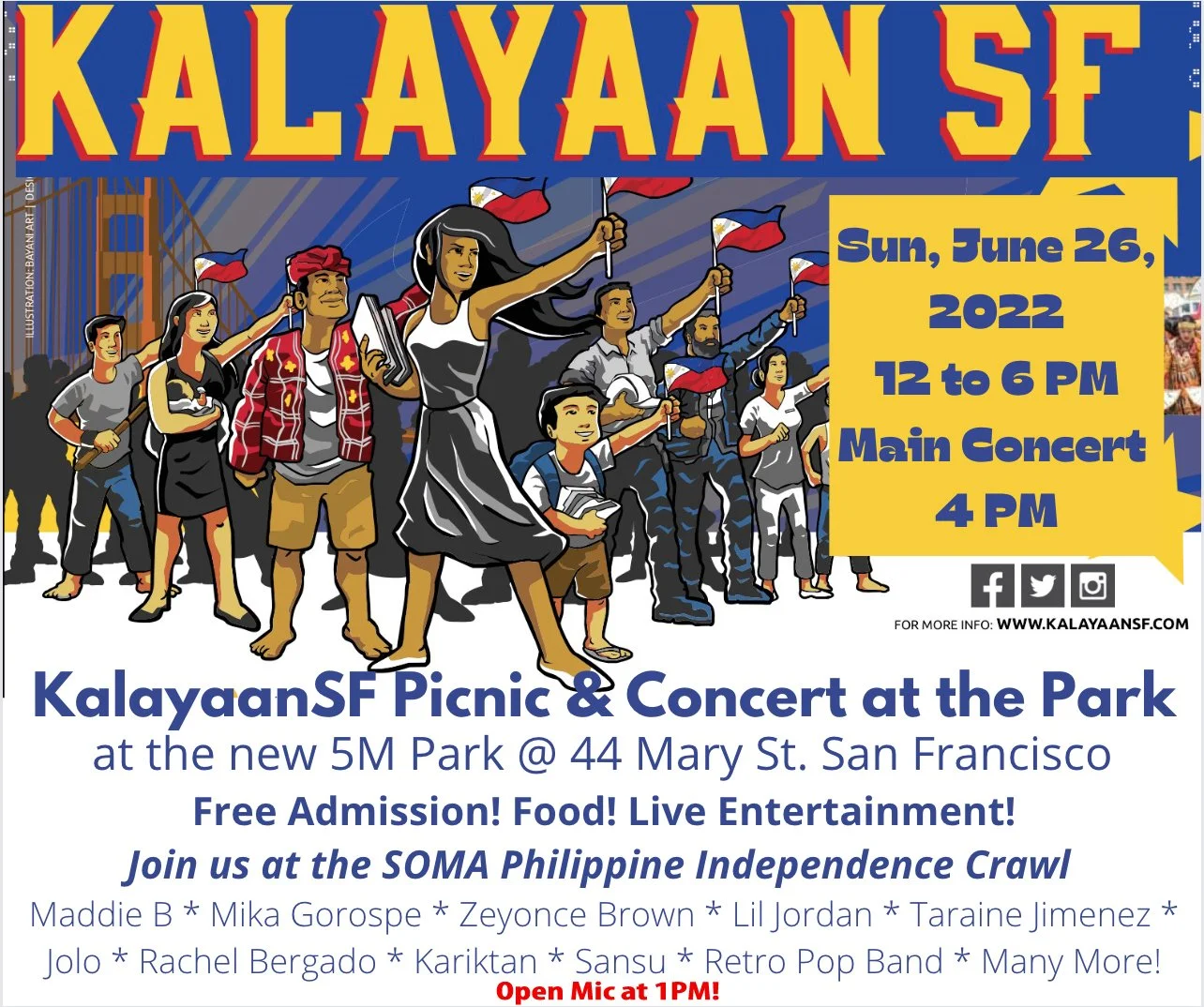 San Francisco Bay Area based KalayaanSF celebrates this august day every year with a grand production right at the heart of the City, either on Union Square or at City Hall. This year, however, after being derailed by the Pandemic for two years, KalayaanSF has partnered with organizations in the newly designated Filipino Heritage District, SOMA Pilipinas in South of Market, and its constant collaborator, the Philippine Consulate General- San Francisco. KalayaanSF Picnic and Concert at the Park will be held at 5M Park at 44 Mary Street (between 5th, Mission and Howard streets) on June 26, 2022 from noon till 7PM.