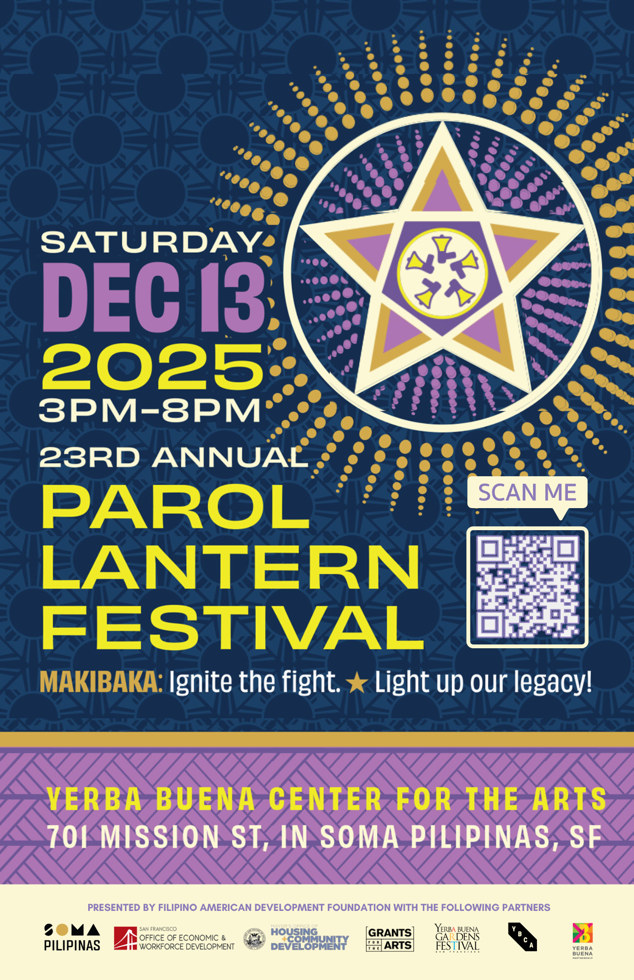 Experience a festive lineup featuring the Taste of Christmas, Parol Stroll, Tala Awards, Parol Gallery, and the MAKIBAKA: A Living Legacy exhibition—all celebrating the creativity and strength of our community. Leading up to the big day, join our free Parol-Making Workshops at YBCA to craft your own lantern and march with us in the parade.