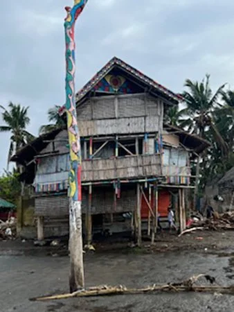 The beach is a kilometer length of black sand. The locals believe: Itom nga balas; bulong sa lawas (black sand is healing for the body)—an ode to the volcanic black sand’s healing power. It is not unusual to see adults buried in the black sand early in the morning, we were told. Upon returning from lunch, the low tide had begun in earnest, and a sliver of beach sand allowed one to walk toward Kape Albarako, a colorfully painted bamboo building that sprawled across 20 meters of beachfront, with a second floor. A few meters away, also on the beachfront, was a taller bamboo house whose stilts clearly demonstrated how high the high tide is on this beach. This was the Alvarado residence. On the lower level, we were told, was Maestro Nune’s work studio, where he also taught young artists, according to his wife, Sally, who greeted us as we tiptoed into the Kape building.