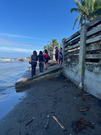 The first adventure was navigating the half-lane footpath-turned-paved footpath into Purok Bougainvilla, the only entry into Margaha Beach, now totally concealed from the path by back-to-back homes, structures, and makeshift resorts. Without the skills of driver, Michael, I would’ve forbidden our car from entering the “Welcome to the Community of Color (of Maestro Nunelucio Alvarado)” entrance to the footpath. After a harrowing inch-apart crawl from car to trisikad (pedaled tricycle) to fence to canal to babies to dogs, we entered a packed parking space of a karaoke-blasting resort, whose very pregnant parking attendant said we could park there and walk to Kape Albarako, the site of the event, which was “next door.” As we walked toward the water, she stopped suddenly and said, “Ooops, indi pa pwede gali kay taas pa ang tubi.” (“Can’t walk there because the water is still too high to walk on the beach.”) Apparently, there is no access from the footpath directly to Kape Albarako! She suggested we go to the next resort where there is also parking and which may be closer to Kape Albarako. Another inch-by-inch crawl to the next resort in the car, and again, I walked out first toward the sea and found the water still lapping up the resort’s walls, at least knee-high from the beach.