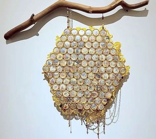 Her playful side shines in Sugar and Spice and Everything Rice (That’s What Filipinas Are Made Of), a bright, cheerful work using rice bags and piña. It marks her first successful attempt to make capiz appear more quilt-like; her earlier efforts involved soldering the shells together. The piece also serves as a tongue-in-cheek response to stereotypes of Filipinas as subservient or delicate. Rowena, who is equally skilled with power tools and needle and thread, admits she asks “too many questions,” even as an introvert. In Rose Colored Glasses, she fashions a pair of spectacles adorned with tiny roses and Swarovski crystals, another meditation on identity and the ways perception can be obscured, seen, perhaps, through “rose-colored glasses.”