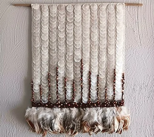 Her Capiz Wave series experiments with the shells to create rippling forms resembling waves and surprisingly, soft fluffy feathers. In Turbulence, Rowena visualizes opposing forces: two cultures tugging at each other, or the tension between family expectations and personal truth. She thinks of the ocean as a single body whose waves push and pull unpredictably, much like life, where things do not always fit neatly together.