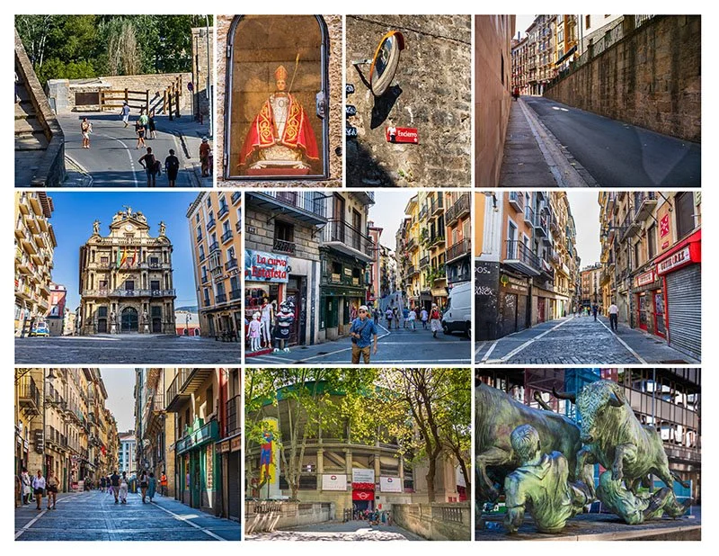 Top row, from left: If you are a bull, you start in the bullpen and wait for the gate to fling open onto Calle Santo Domingo. If you’re human, you pray before the niche of San Fermin, 100 meters from the bullpen, and start running when the bulls approach. On the wall next to San Fermin’s statue is a red sign that marks the bull run’s route; there’s a mirror next to it because the road curves up from the bullpen. Calle Santo Domingo slopes up from the bullpen; the direction of the run is to the left.
