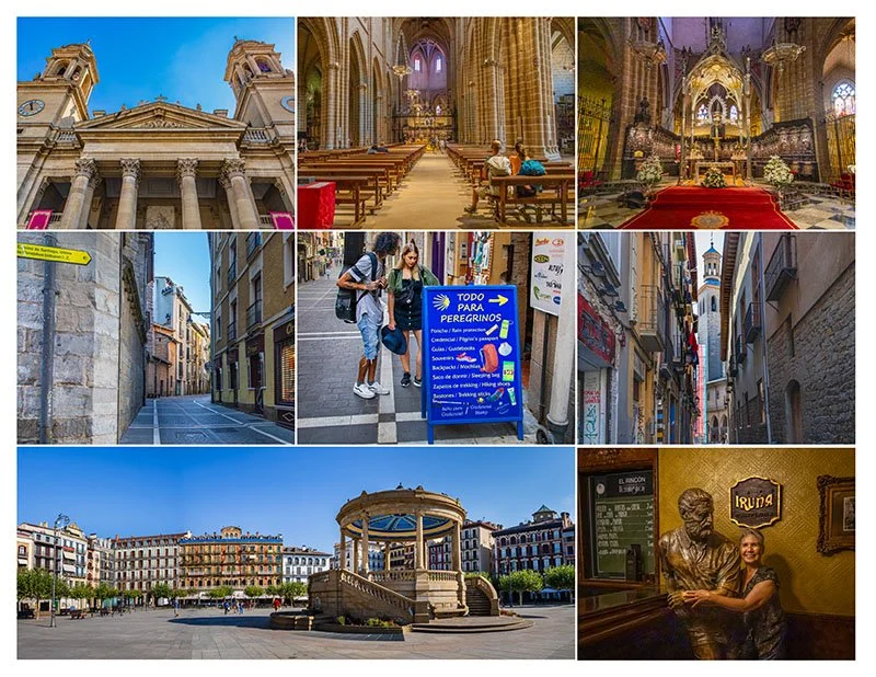 Middle row: Many streets, like these ones, are marked with the yellow Camino arrow. Because Pamplona is a major stop on the Camino Francés, it has several pilgrim-supply stores (middle).