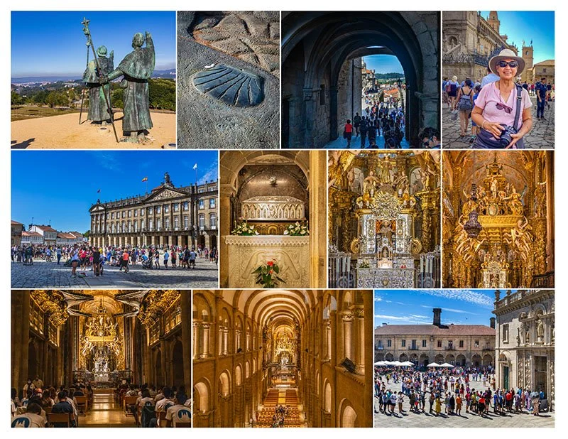 Top row, from left: Two pilgrim statues on Monte do Gozo point toward the spires of the Santiago Cathedral five kilometers away. The twin white thank-you stones that I left at Monte do Gozo. Pilgrims on their last few Camino steps as they approach Praza do Obradoiro for their first glimpse of the Santiago Cathedral’s magnificent façade. Me arriving from Monte do Gozo at Praza do Obradoiro.