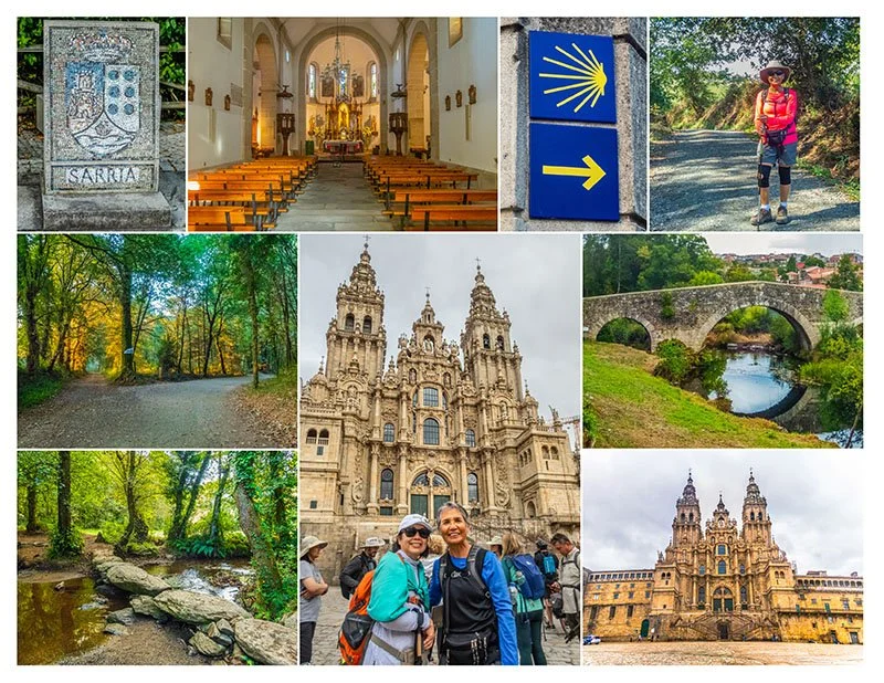 Top row, first two photos: My friend Nadja and I started in the town of Sarria at the Iglesia de Sta. Mariña where we attended Mass and got the first stamp on our Camino passports. We followed the yellow arrows until we reached the Cathedral of Santiago de Compostela (middle photo). Last photo: The Santiago Cathedral one early, rainy morning before the rush of pilgrims. (Photos by Odette Foronda)