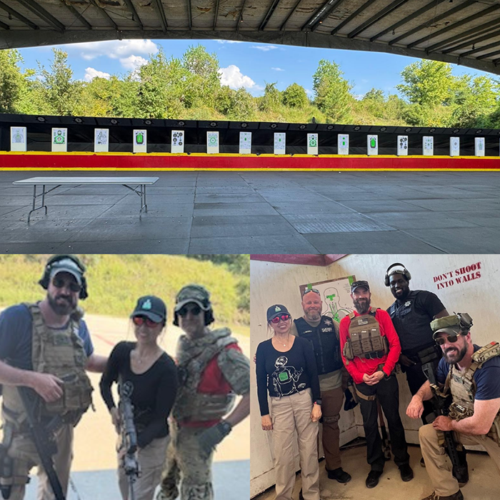 This picture shows the sponsorship of M-One TARGETS at the Annual IALEFI shooting conference in Houston, Texas. Photos of Firearms instructors with Tess. Lower Left Photo: L-R: From Left to Right: Ted, Tess, Scott. Lower Right Photo: Tess, Drake, Alton,Ted (Photos by Buddy Turney)