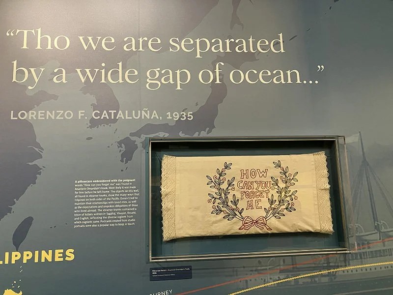 The wall of distance and longing. The map illustrates the physical distance between the United States and the Philippines, and the travel paths of Pablo Solomon, Enrique Andales and Eusebio Maglinte. The embroidered pillowcase with the exhibition’s title, How Can You Forget Me. The interactive panels invite a closer look, my teenager lingered at the interactive displays, lifting panels to uncover hidden stories.