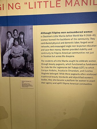 The presence of women. Pillars of Litle Manila broadens the narrative beyond male laborers, the exhibition highlights the role of women in sustaining community life, even though fewer objects survive to tell their stories. Barbara Nambatac, whose photographs and intricate white lace gown are on display, joined the contest to raise money for the Stockton Legionarios del Trabajo. There is also an interesting photograph of a woman laborer wearing high heels that makes one wonder how she survived the day picking produce. Mangahas also points out that a photo of Concepcion Ruiz Sepe Lagura, a female member of Legionarios del Trabajo was used to explain the significance of the lodge.