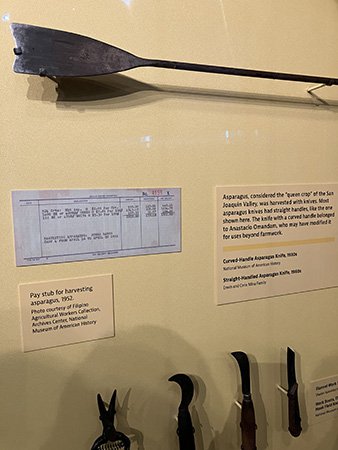 The asparagus knives in Backbreaking Labor. Mahirap Na Paggawa. The displayed tools are lined up like surgical tools. The accompanying photo of Filipino farmworkers bent over the field gives renewed respect for the term “backbreaking labor.” The quote from Erwin Mina, “Every Filipino farmworker owns one of these hoes. They broke the backs of generations of farmworkers,” tell a harsher story: bent backs under punishing sun, repetitive labor, and racial hostility. This is in direct contrast with the startlingly large photographs (nine feet in height) of the manongs dressed in elegant suits and sexy swimwear projecting dignity, masculinity, and aspiration.