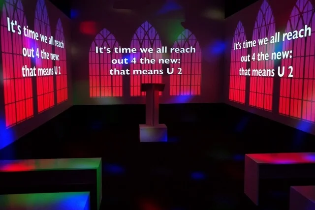 The media room is transformed for Jennifer Wofford’s popular installation: “Dearly Beloved: A Karaoke Chapel” (Photo: © Jenifer Wofford)