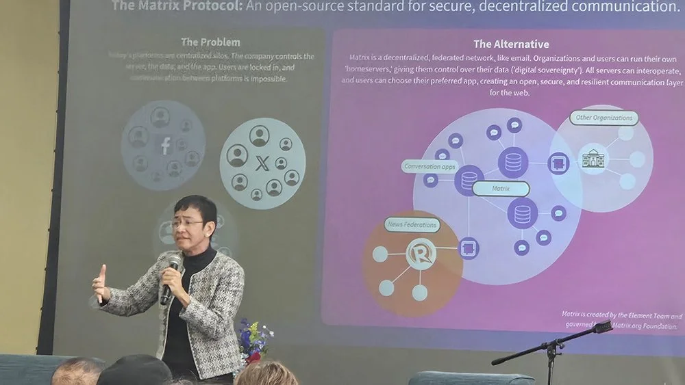 She described the killings of journalists, lawyers, and judges—examples of how democracy erodes when truth is weaponized. “Many of our families believed the lies that spread like lightning, enabled by the tech we carry in our pockets.” She emphasized that the same disinformation tactics later appeared in the United States.