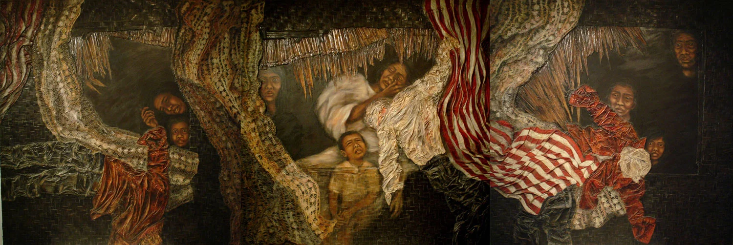Pasyong Bayan (1983). oil on canvas and collage on sawali mounted on plywood, 3 pieces totalling 178 x 526.5 cm. Her “agony and ecstasy ” work during the rage against martial law and the massive human-rights violations committed under the Marcos regime.(Photo is courtesy of Imelda Cajipe Endaya)