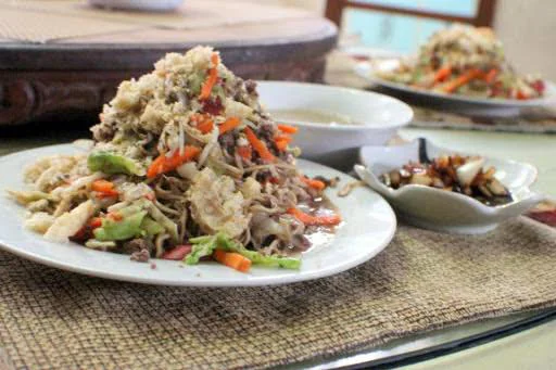 · Ladle the soup in individual bowls and serve together with the noodles which are on a serving plate. Serve warm with the side dipping sauce of soy sauce, vinegar and sliced onions.