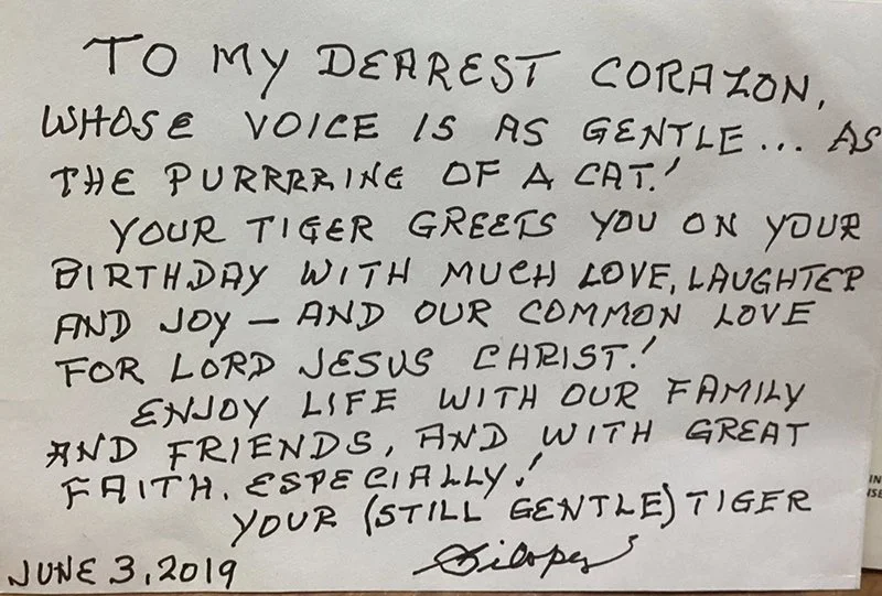 On Feb. 16, 1974, Corazon and Gilopez Kabayao were married in Los Angeles, CA. The wedding date was the closest they could get to Valentine’s Day which fell on a Thursday that year. Corazon liked to tease him about how lucky he was to have a much younger wife to take care of him. In loving notes and cards to her, he signed himself as “The Tiger.” He described her as his always gentle purring pussycat. Along with his buddies, Doctors Gil Villanueva and Emil Salcedo, he proudly proclaimed himself a founding member of UHAW (Union of Husbands Adored by their Wives).