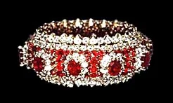 One of the smaller baubles, from the Roumeliotes collection. Ruby and diamond bracelet with ten 5 cts. pigeon blood red rubies surrounded by smaller rubies and diamonds in yellow gold. 1.5 inches wide X 8” long. Marked Van Cleef & Arpels, NY. Item# 36, page 5 PI customs list. (Photo courtesy of Diana Limjoco)